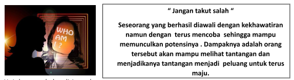 Belajarlah dari kesalahan karena di balik kesalahan itu ada sisi positif, sisi positifnya adalah koreksi untuk menjadikan kamu untuk memperbaikinya , untuk memperbaiki sebuah kekeliruan tentunya harus ada strategi atau cara, disini dituntut adanya kemauan dari orang tersebut untuk berfikir mencari solusinya, intinya adalah jangan takut melakukan suatu kekeliruan karena bisa jadi kekeliruan dan kesalahan itu menjadi cambuk untuk terus membenahi kemampuan dan mengasah diri agar lebih baik lagi. Dan jangan lupa beri aplus untuk diri sendiri sebagai penghargaan atas keberhasilan yang telah di raih. Gelorakan optimismu dan Do it, yes you can lakukan itu jika kamu memang mampu melakukannya.